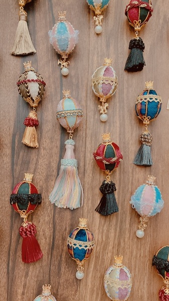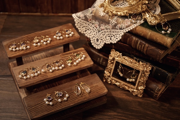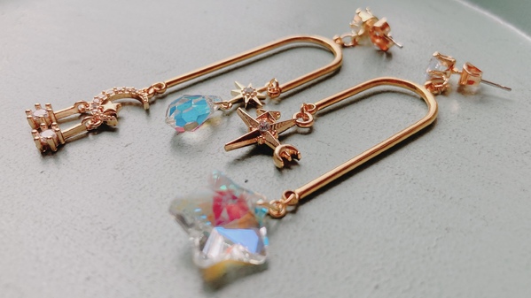 【ウダカ(娘)】木目込みを使った、軽くて存在感のある気球風のイヤリング&ピアスを中心に、気球モチーフやガラスボタンをリメイクしたアクセサリーを製作。今回は星モチーフのキラキラした揺れるアクセも販売します。