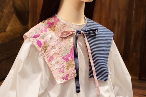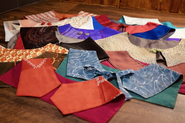 【みっく(母)】着物などの古布を使ってつけ襟や蝶ネクタイなど、どこか懐かしいけど斬新な色柄をリメイクして今風にアレンジした服飾小物を製作。柄や組み合わせは全て1点もの。人と被ることのない個性的でワンポイントに合わせやすい服飾品がオススメ。