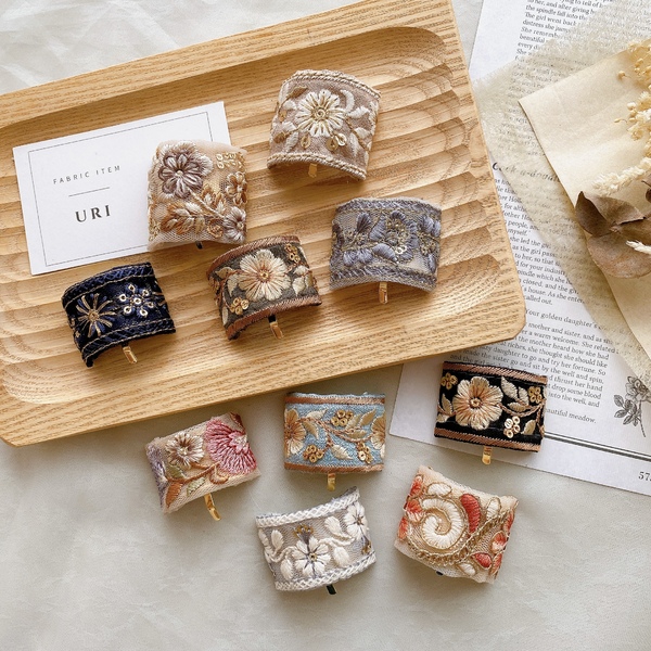 インド刺繍リボンを使った布小物(ショルダーストラップ、バッグ、ポーチ他)とヘアアクセサリー