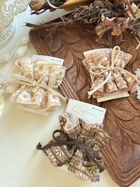 インド刺繍リボンのアクセサリー、ヘアアクセサリー、ショルダーストラップ、ポーチ、ネックレスなど。