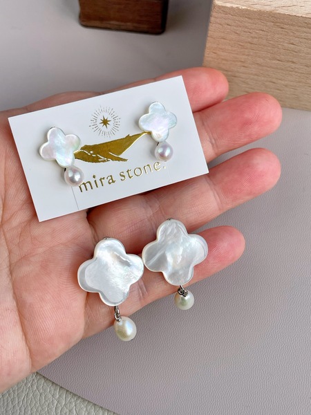 白蝶貝のクローバー耳飾り 天然石と淡水パール
