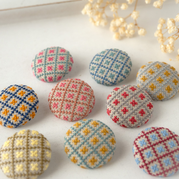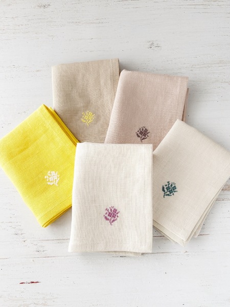 上質なリネンに、デンマーク製の花糸でクロスステッチ刺繍を施し、すべてオリジナル図案でひと針ひと針丁寧に仕上げています。