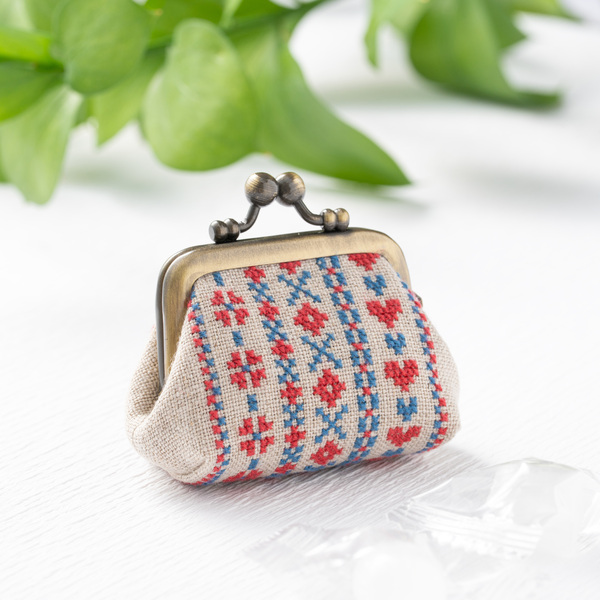 ワインレッド|ボーダー刺繍のリネンミニがま口ポーチ(SS)|全面手刺繍