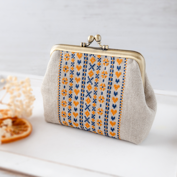 オレンジ|ボーダー刺繍のリネンがま口ポーチ(M)|手刺繍