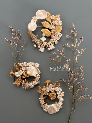 淡水パールと真鍮のリースブローチ