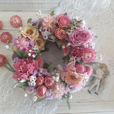 ピンクのドライフラワーリース