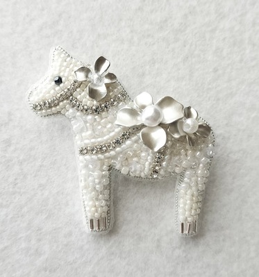幸せを運ぶ 純白のダーラナホース|ビーズ刺繡 2wayブローチ・バッグチャーム